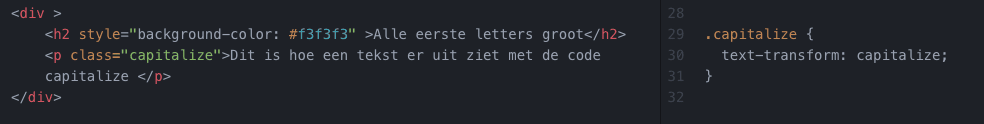 Deze code zorgt ervoor dat alle eerste letters van de woorden in de tekst hoofdletters worden. Als deze letters al hoofdletters zijn in je HTML tekst (links) dan blijven deze ook groot op je website. Daarom heb ik hier in mijn voorbeeld HTML tekst alleen maar kleine letters getypt. Na het toepassen van de CSS code (rechts) kun je in het voorbeeld in de foto zien dat inderdaad elke eerste letter een hoofdletter is geworden.